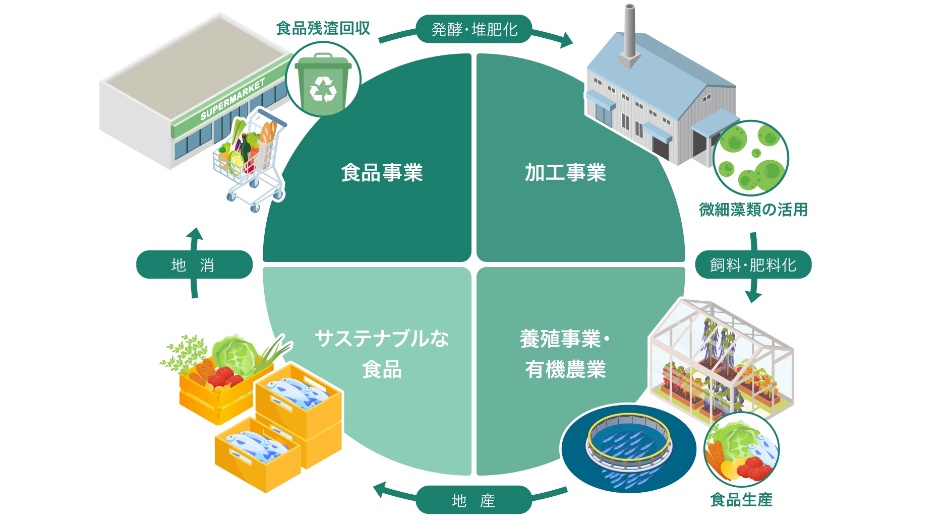 最終的には、サステナブルな水産飼料、農業用肥料を地域社会に提供するだけでなく、地産地消のサプライチェーンをパートナ様との協業によって構築し、循環型地域社会の実現に貢献します。
