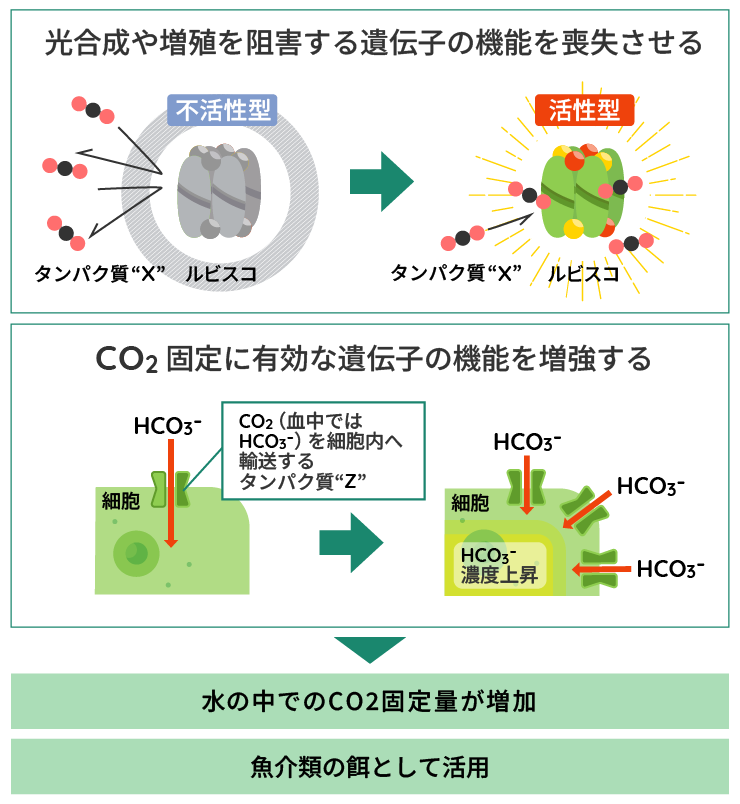 光合成や増殖を阻害する遺伝子の機能を低減させる品種改良技術により、より多くのCO2を吸収ししながら、速く増殖する藻類を開発しています。